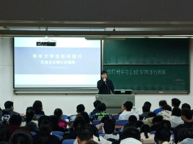 19级辅导员李巧中老师以“青年大学生如何践行社会主义核心价值观”为主题,分别从社会主义核心价值观的内涵、如何自觉践行等方面进行解读,强调大学生肩负民族的希望和未来,应以社会主义核心价值观为指引,做自觉的践行者。