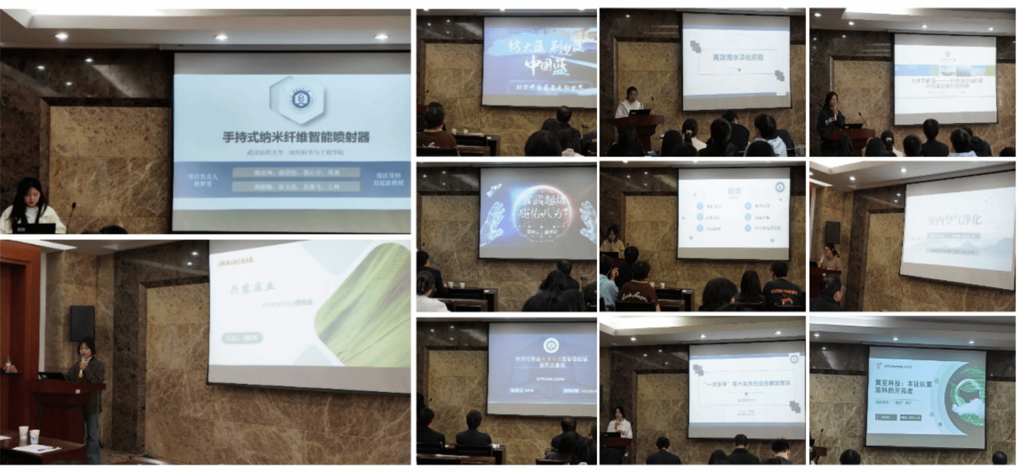 参加本次论坛的各项目汇报人依次介绍自己的项目。刘东方介绍了一种供液可调的光热蒸发芯鞘纱,陆佳润介绍了“竹衣净水—生物质资源利用的领导者”项目,顾佳音介绍了“兴农麻业”项目,刘鑫介绍了“一衣多穿”-草木染天然变色服装面料,杨梦雪介绍了一种手持式纳米纤维智能喷射器,雷一鸣介绍了“室内空气净化”项目,祝元宵介绍了纳米纤维基温度响应型智能保暖气凝胶絮片,王瑞雪介绍了‘蓝天卫士——让“麻”烦不再麻烦’项目,占晨晨介绍了“翼笙科技——本征抗菌面料的开拓者”项目,师博介绍了“守住一抹蓝——荆楚蓝染非遗活化融合创新一体化方案”项目,唐予言介绍了一种高性能混编复合绳,王胜男介绍了高效海水淡化织物,武艺霖介绍了“废弃咖啡渣色素提取及对蚕丝的染色”项目,吴梦涵介绍了无“声”而“织”-高性能气凝胶隔音降噪材料。各位同学汇报结束后,评委老师就项目内容与汇报的同学进行了交流,对各个项目进行了点评指导。