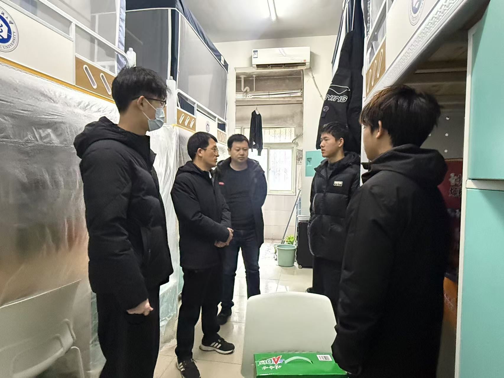 党委书记朱张军带领辅导员老师们深入13栋一站式学生宿舍,开展寒假留校学生走访慰问活动。