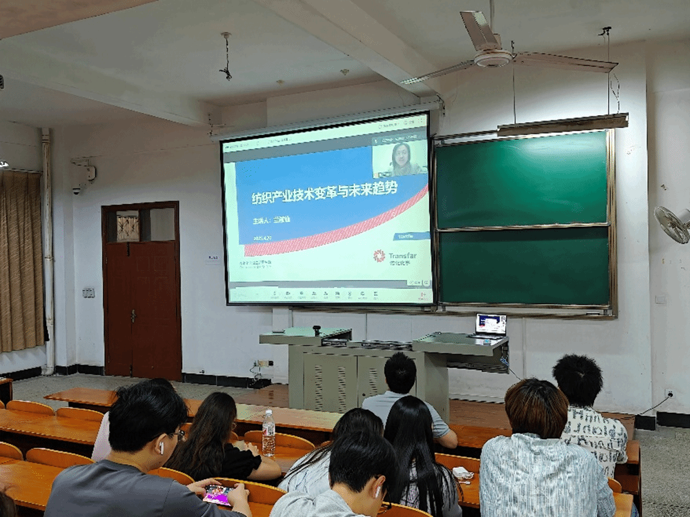 为进一步拓宽研究生视野增强研究生职业规划的积极性,科学性,4月20日晚上传化化学集团产品与应用技术部副总经理、91届优秀校友兰淑仙女士正在通过远程视频讲解纺织产业技术变革与未来趋势全体研究生在8FT101参加了学习,2022级全体本科生和辅导员余国铖老师在03-T202参加了学习,研究生辅导员学工办主任梁祥云老师主持活动