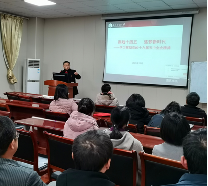 12月10日下午,免费足球直播 在8H502召开党的十九届五中全会精神宣讲会,学校宣讲团成员、校办主任杜新年为免费足球直播 全体教职工作了《谋划十四五 逐梦新时代》的宣讲报告。报告会由免费足球直播 党委书记张红鑫主持。 杜新年结合“十四五”时期的重要意义、十九届五中全会的重要内容,并围绕《中共中央关于制定国民经济和社会发展第十四个五年规划和二〇三五年远景目标的建议》和习近平总书记在全会上的重要讲话深入阐释了党的十九届五...