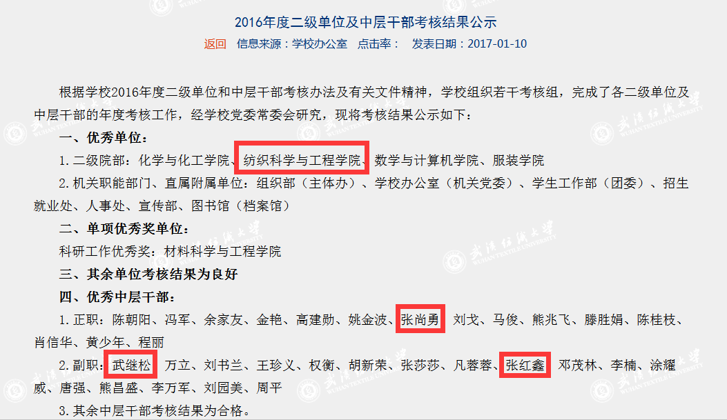 根据学校2016年度二级单位和中层干部考核办法及有关文件精神,学校组织若干考核组,完成了对各二级单位及中层干部的年度考核工作。经学校党委常委会研究,1月10日,相关考核结果在校园网主页予公布。根据考核,我院从22个二级院部中脱颖而出,获评先进单位(二级院部共4个);免费足球直播 党政领导张尚勇、武继松、张红鑫分别获评优秀中层干部(全校仅32名)。